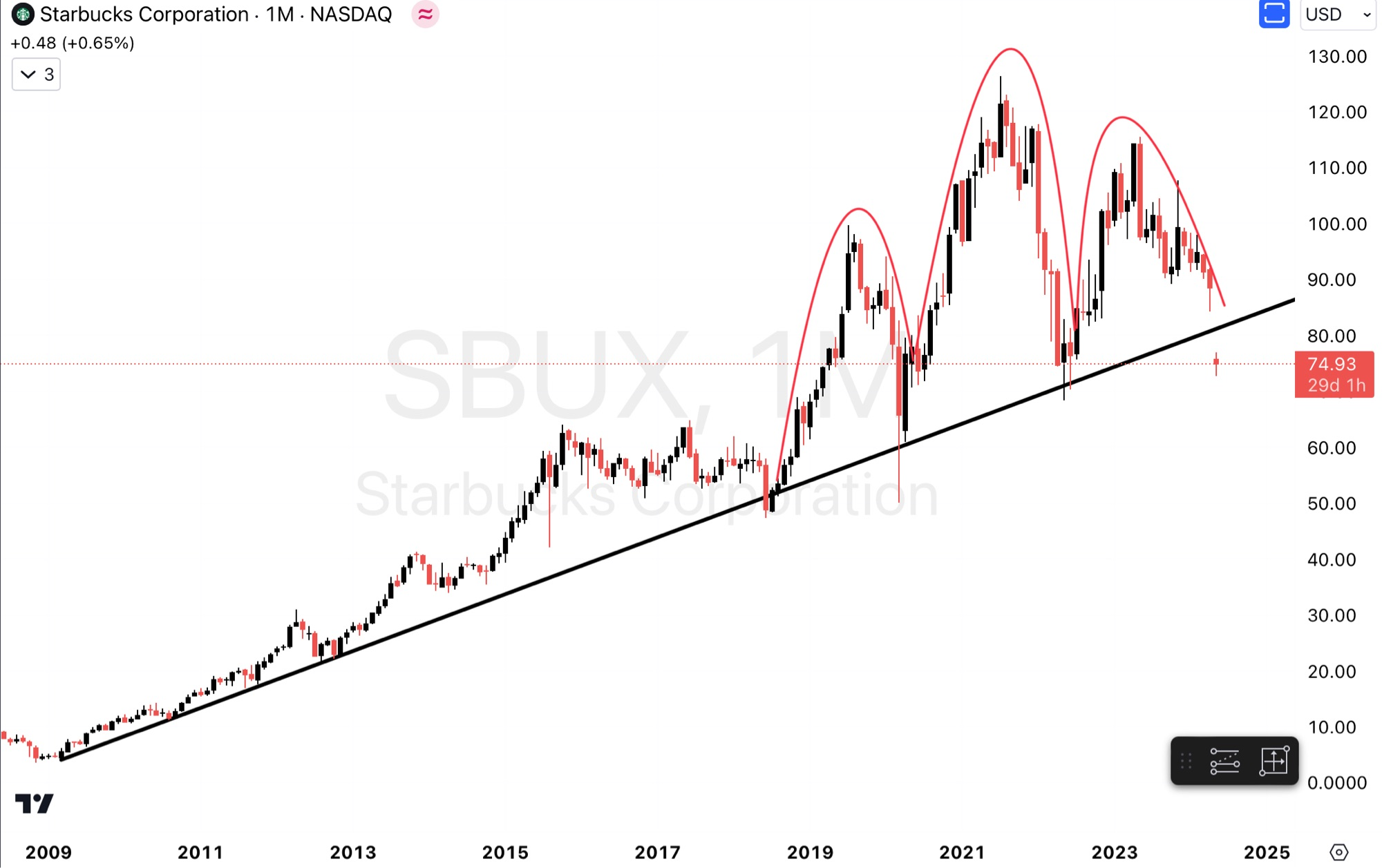 แน่นอนว่าลงมาระดับนี้ เหลือ P/E 20 เท่า!! สำหรับ Starbuck เกิดขึ้นไม่บ่อยครับ Valuation นี้ถือว่าถูกเมื่อเทียบกับตัวเองในอดีต คำถามคือ คุณยังเชื่อหรือไม่ว่า สตาบัคจะยังโตได้ในระดับเดิม หรือ กำไรจะโต 15% ต่อปี แบบที่ CEO ตั้งเป้าไว้รึเปล่า